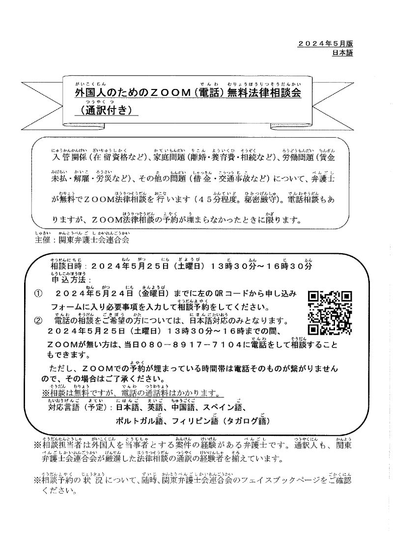 5月(がつ)25日(にち)土曜日(どようび)1:30pm ~ 4:30pmに 外国人(がいこくじん)のための 無料(むりょう)の 法律(ほうりつ)相談会(そうだんかい)が あります。ZOOM または 電話(でんわ)で 相談(そうだん)できます。通訳(つうやく)も あります。詳しくは(くわしくは)チラシを 読んで(よんで)ください。