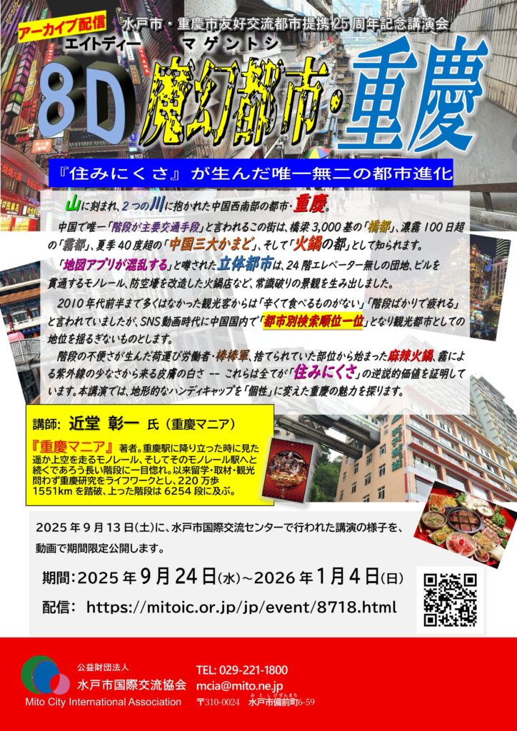 水戸市と中華人民共和国・重慶市は、西暦2000年に友好交流都市となり、今年25周年を迎えました。それを記念し、去る9月13日に、重慶について詳細かつマニアックに記述した、日本一詳しい重慶本『重慶マニア』の著者、近堂彰一さんを講師に迎え、重慶の魅力についてお話しいただきました。当日ご参加の方々からは、「こんなに興味深い街が、中国にあるとは!」「重慶に行ってみたい!」というご感想を多数いただきました。