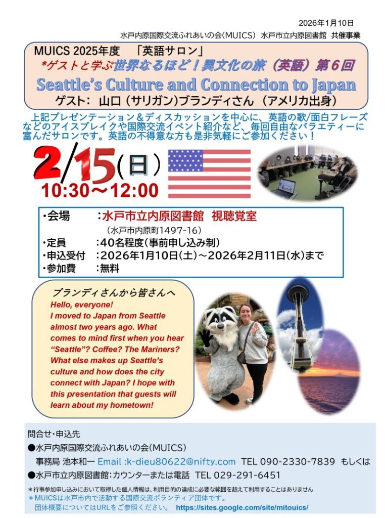 こちらは水戸市内原地区を中心に国際交流活動を実践する「水戸内原国際交流ふれあいの会(MUICS)」です。 MUICSより、2026年2月の「英語サロン:ゲストと学ぶ 世界なるほど!異文化の旅(英語)第6回」についてご案内します。