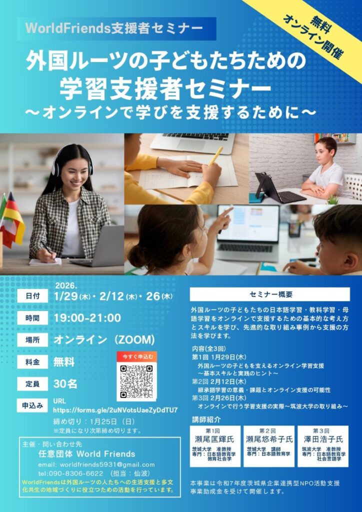 「World Friends」は、子どもたちとその保護者を対象に日本語・母語・教科学習の支援活動を行っている任意団体です。このたび、「令和7年度茨城県企業連携型NPO活動支援事業」で茨城県と県内の企業様の支援により、「外国ルーツの子どもたちのための学習者支援セミナー~オンラインで学びを支援するために~」を開催します。外国ルーツの親子への支援活動をしている方、またオンラインでの支援活動に関心がある方のご参加をお待ちしております。