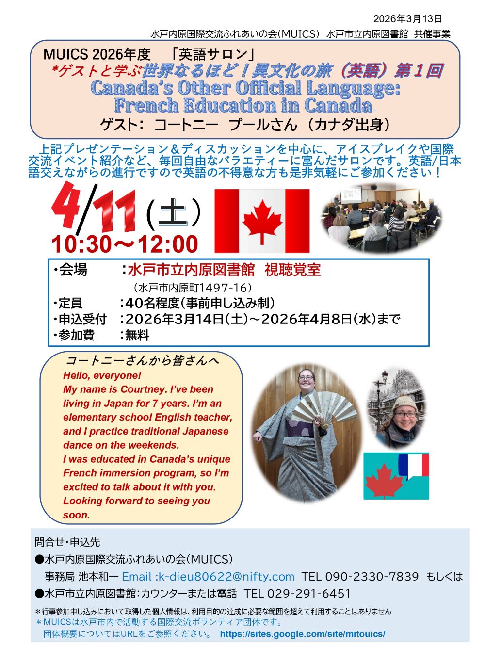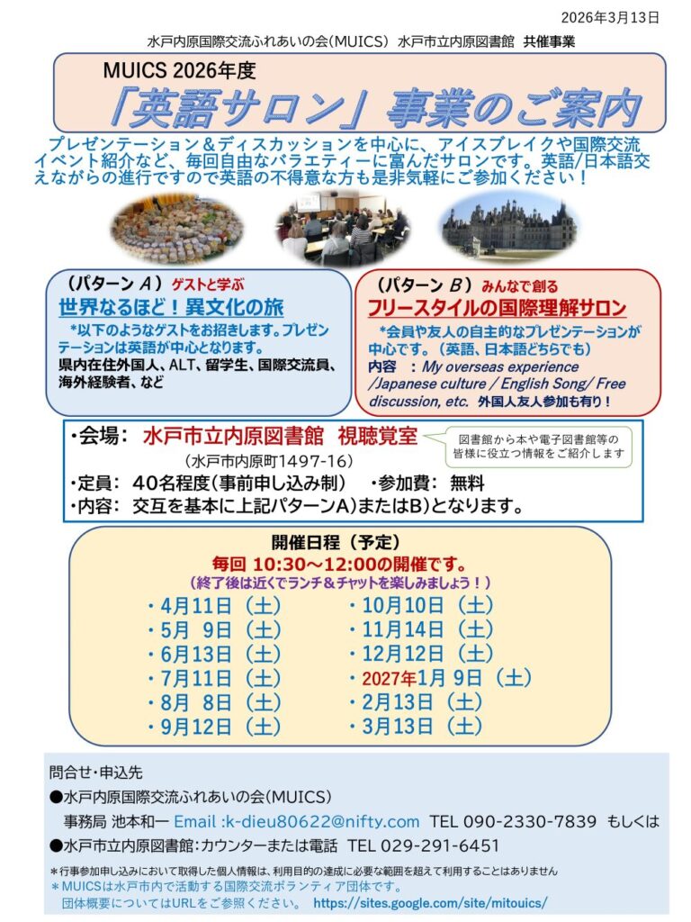 水戸内原国際交流ふれあいの会(MUICS)から、2026年度「英語サロン」のご案内と参加者募集のお知らせです。