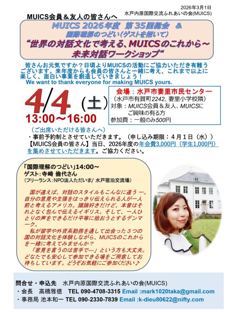 ◆MUICSでは、英語サロンの他、様々な国際交流事業を実施しています。年会費は3,000円(学生1,000円)です。会員の皆さんへは各事業への参加に補助が付きます。ご興味の有る方は是非4月4日(土)開催の総会&「国際理解のつどい(ゲストを招いて)」にもご参加ください。日程/場所/会費/内容などについては、チラシをご参照ください。